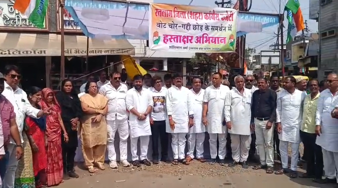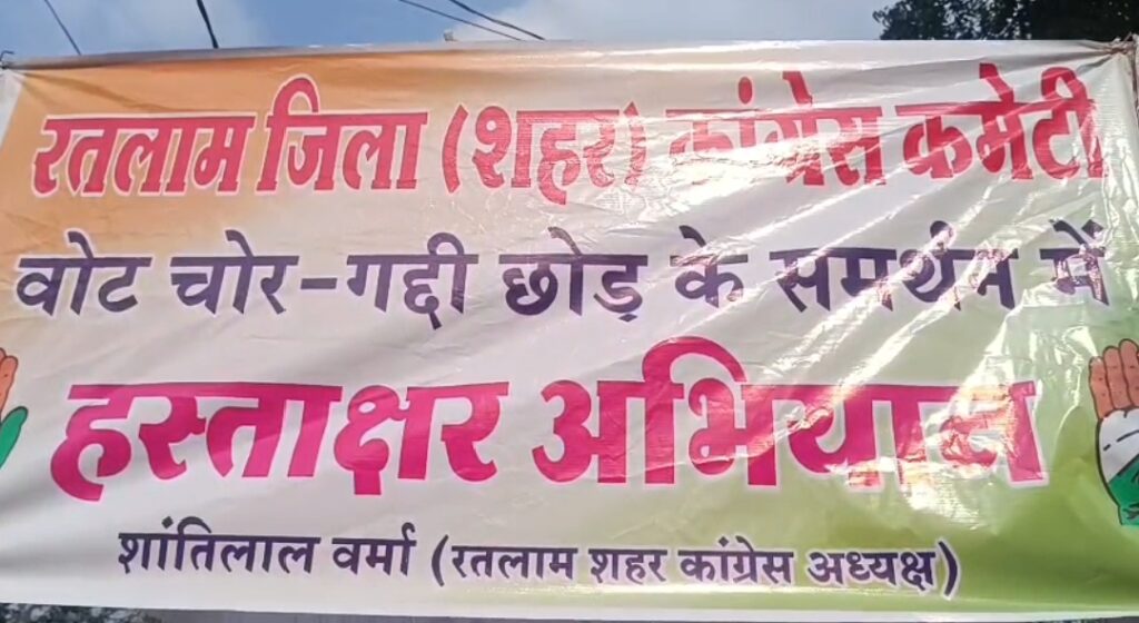 रतलाम–शहर कांग्रेस द्वारा वोट चोर गद्दी छोड़ मिशन पर स्टाल लगाकर हस्ताक्षर अभियान चलाया।